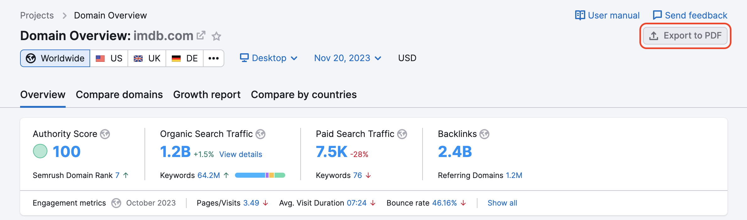 - Export data from Domain Overview to PDF or create your custom report with the My Reports tool. Combine data from Domain Overview, other Semrush tools, Google Analytics 4, Google Search Console, and other sources to create custom PDF reports. Align the reports with your brand and schedule automatic updates for seamless report automation.