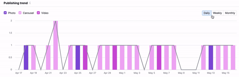 The Publishing Trend shows the trend of your competitor’s posting habits over time. You can set the graph to show daily, weekly, or monthly totals.