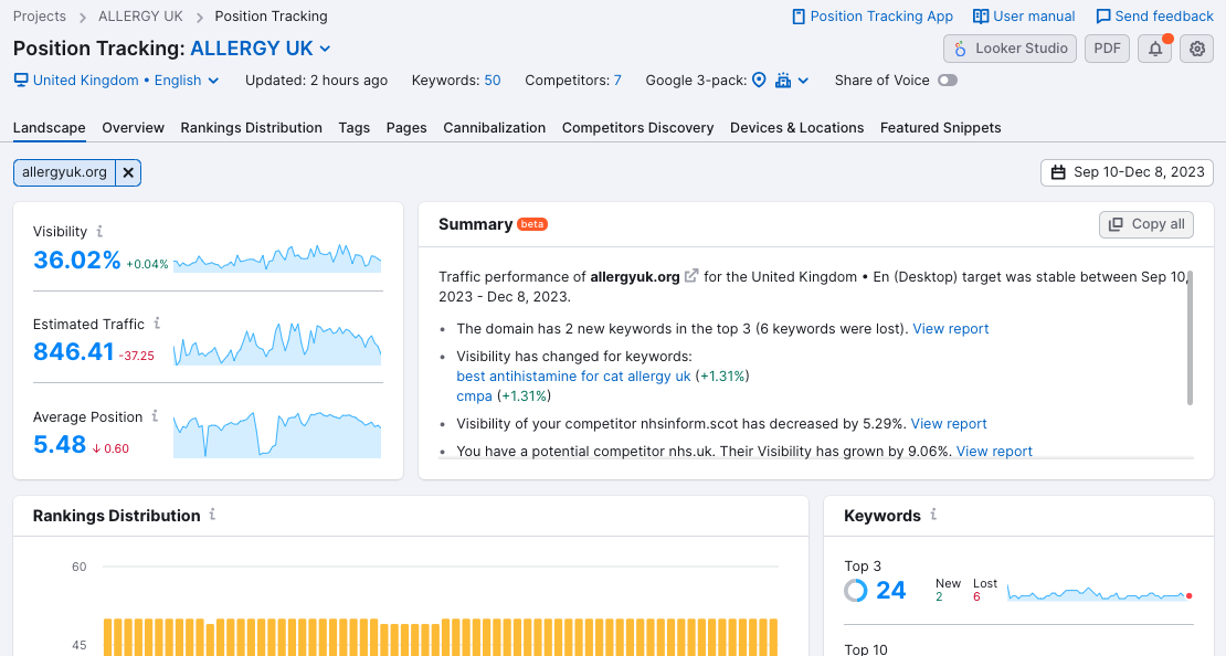 In 2023, we added a widget called “Summary” to the Position Tracking Landscape report. This new widget provides a short text summary of the latest changes for the main website you’re tracking (either your site or an added competitor). It includes insights, such as: