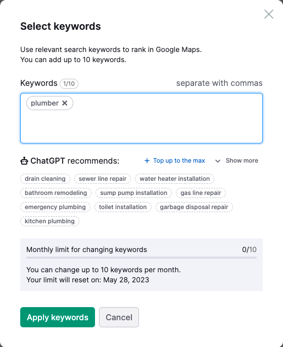 Previously, Heatmap results were based solely on the keywords our users track, but we wanted to give you more. Now, we’ve introduced AI-generated keywords in the Heatmap report, recommended by ChatGPT. This feature suggests keywords based on your business name and category, simplifying the process of discovering and monitoring additional keywords related to your business location.