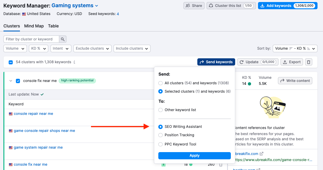 In Keyword Manager, choose the desired keyword clusters for your content and click “Send keywords” to seamlessly transfer them to SEO Writing Assistant.