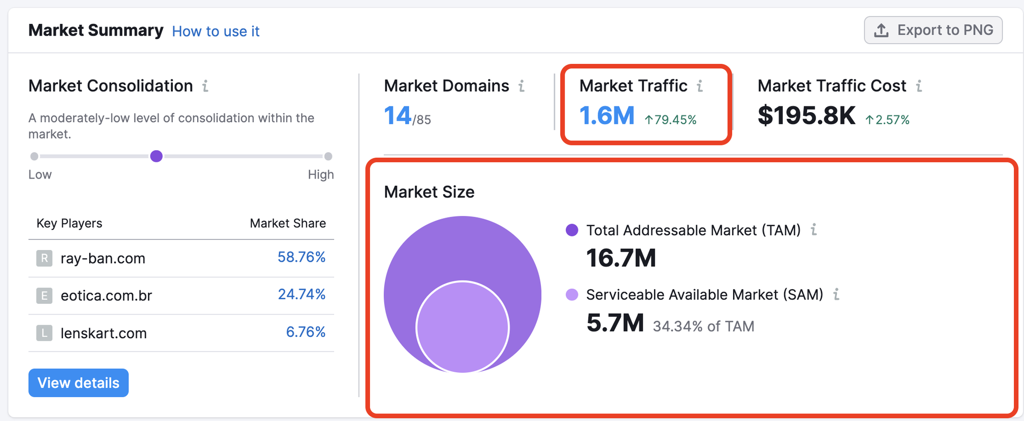 For example, here’s a look at the market for Ray-Ban sunglasses in Brazil using Semrush’s Market Explorer. In Brazil, traffic in the sunglasses market is increasing, and the TAM and SAM reflect a broad market with plenty of room for growth.